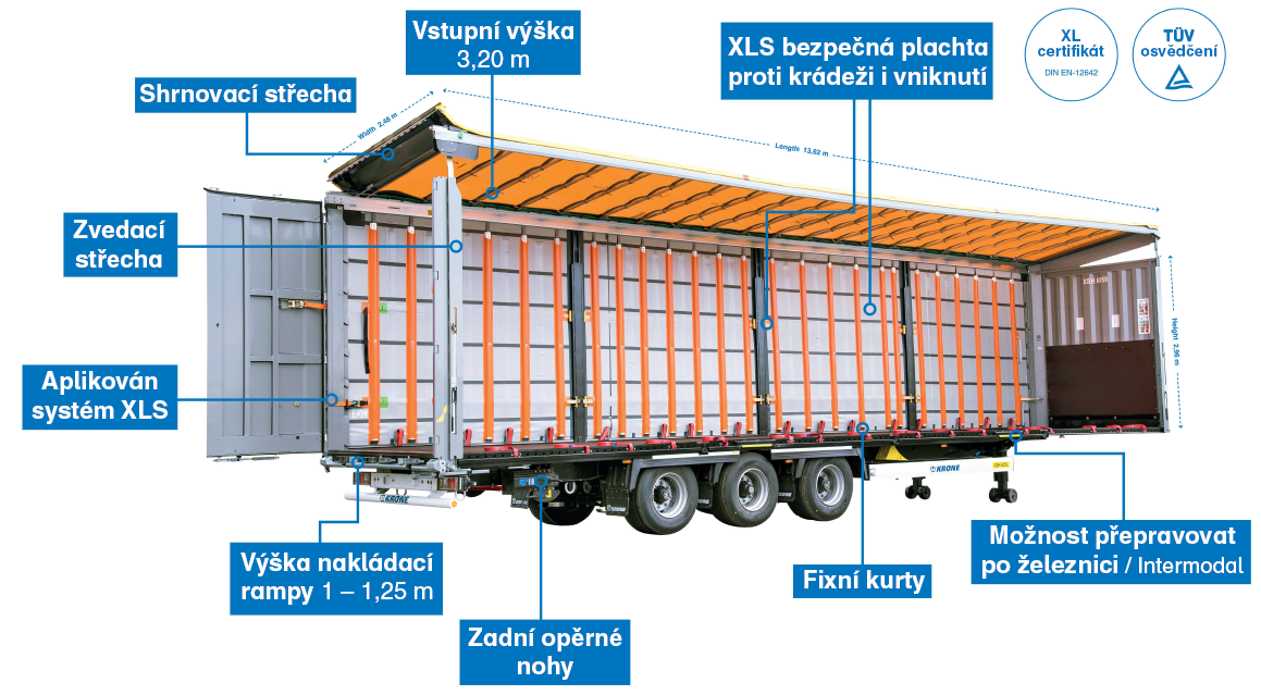 Konstrukce našich návěsů Mega Huckepack XLS jsou vybaveny pro náklady, které mají tendenci se usazovat a vyboulit. Takové náklady (jako: role papíru, pneumatiky, balíky sena nebo slámy, pytle s granulemi, role s krytinami) se mohou bezpečně opřít o boky přívěsu, aniž by hrozilo, že se přívěs vyboulí a roztáhne se za maximální povolenou celkovou šířku. Naše návěsy mají značku certifikace na své plachtě.
